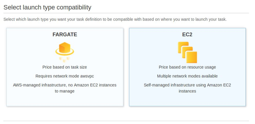 2. For Step 1: Select launch type compatibility, choose EC2 and then choose Next step.
