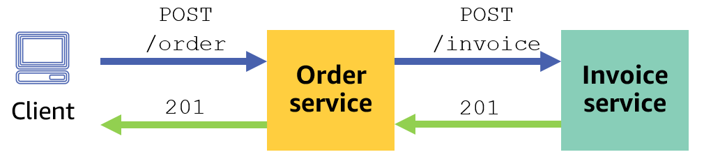 For example, the client makes a POST /order request to the order service. The order service accepts the request and returns that it has been received, without waiting for the invoice service. The order service then makes an asynchronous POST /invoice request to the invoice service, which can then process independently of the order service. If the client must receive data from the invoice service, it can handle this separately via a GET /invoice request.
