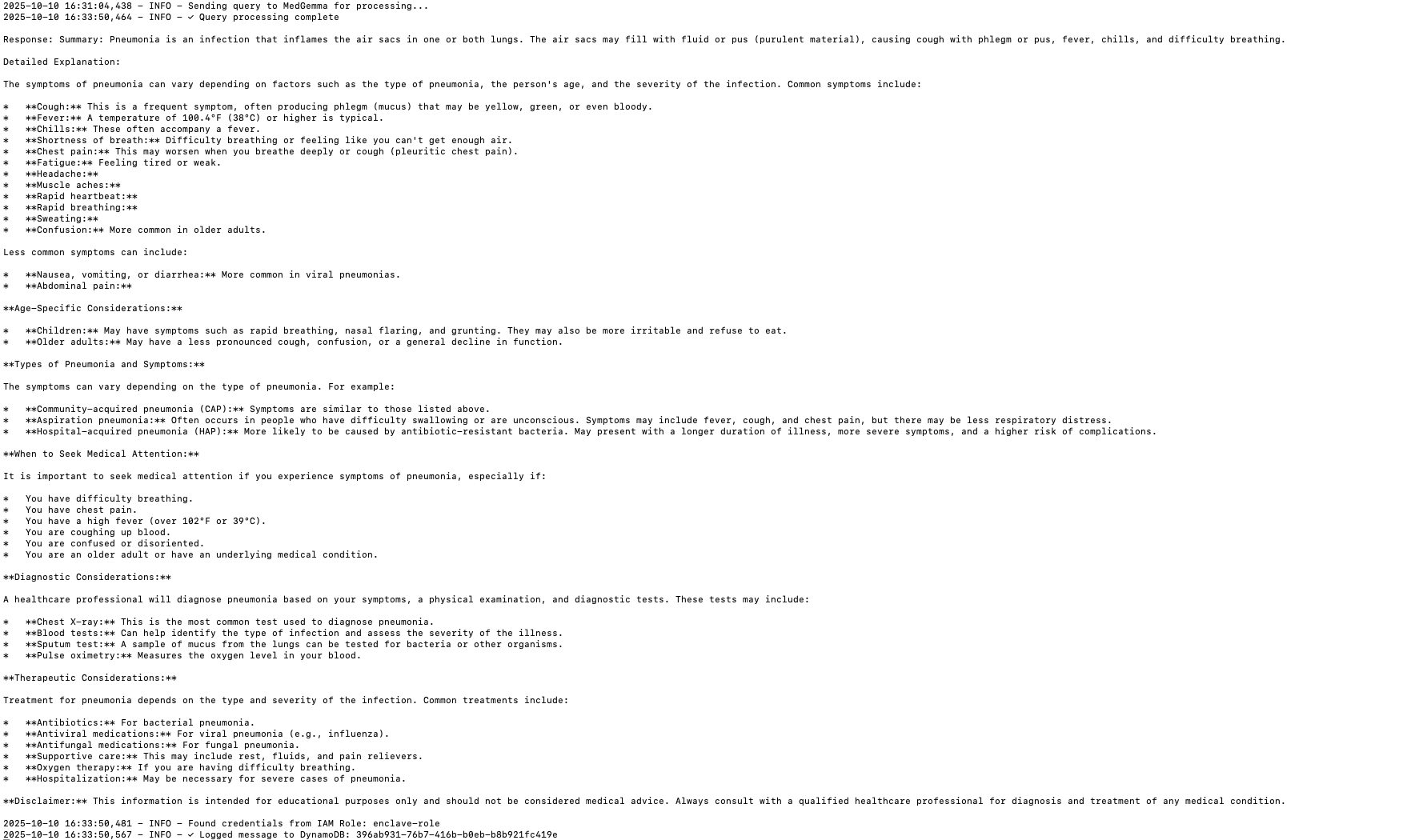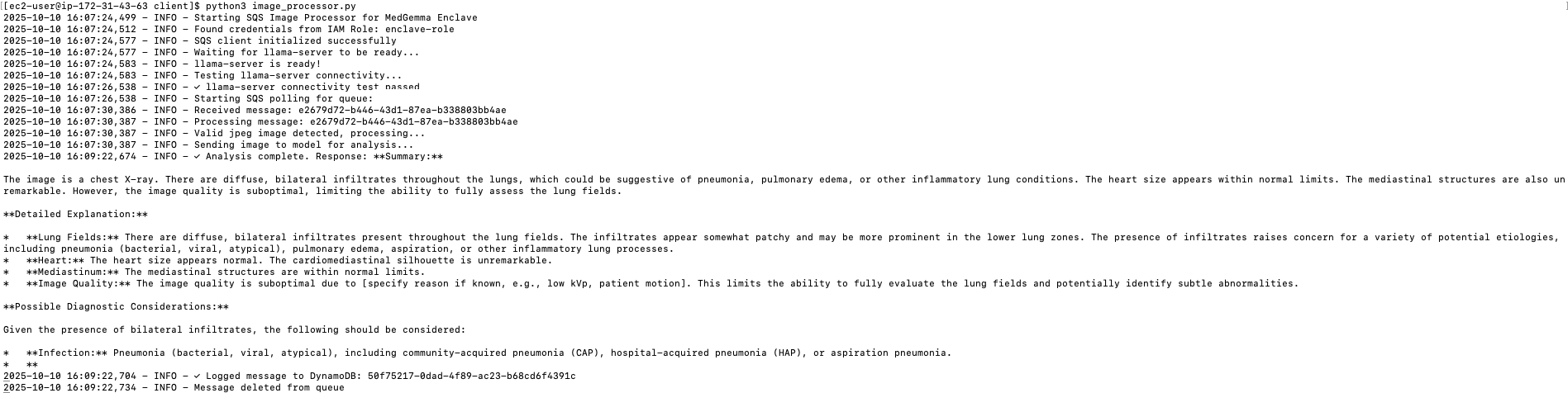 In this project, MedGemma 4B serves as a reference medical LLM, showing how domain-adapted fine-tuning can enhance a model’s ability to interpret, reason about, and respond to complex medical queries. It also provides a foundation for exploring the safe and effective use of LLMs in healthcare applications, while being securely deployed within a Nitro Enclave. However, you can choose to deploy your own medical FM if needed. This is a deeper overview on the 4B model.