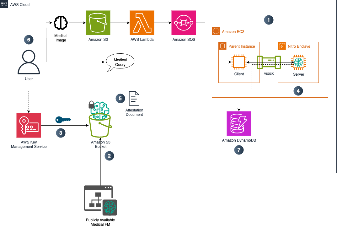 This solution outlines how to build a more secure end-to-end pipeline that enables zero trust medical LLM publication and inference with Nitro Enclaves. This post demonstrates a guide for setting up an Amazon Elastic Compute Cloud (Amazon EC2) instance with Nitro Enclaves enabled, downloading and encrypting a publicly available FM to an S3 bucket with an AWS KMS key, sending medical text and image-based queries to an SQS queue for processing, and storing results in an Amazon DynamoDB table.