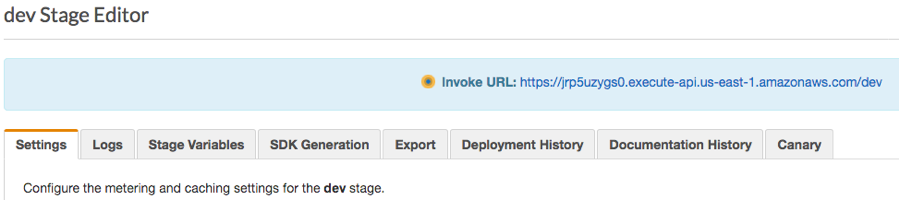 - The page automatically redirects to the dev Stage Editor for your API, which shows the Invoke URL value.