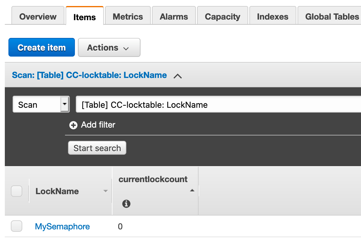 The application uses Conditional Writes to store and manage the state of the semaphore in DynamoDB. The Acquire Lock task uses the DynamoDB service integration to update the record, which stores lock information, and to atomically increment the currentlockcount attribute by 1. It also adds a new attribute with a key equal to the current execution ID and a value of the time that this state executes.