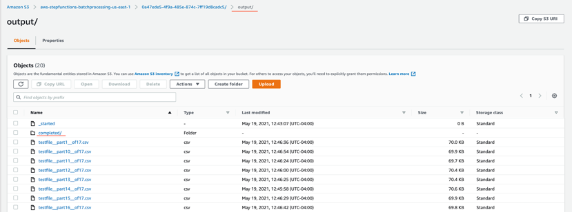 - Once all the child workflows are processed successfully, the next task state is Merge all Files. This combines all the processed chunks into a single file and then stores the file back to the S3 bucket.