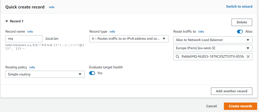 - Go to the Route 53 hosted zone and create a new subdomain record set, such as mq.example.com, that matches the ACM certificate that you previously created.