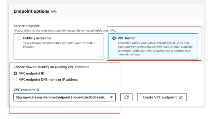 5. For the Storage Gateway Service endpoint connection, you can create a VPC endpoint for Storage Gateway and specify the VPC endpoint ID from the dropdown selections for a private connection between the gateway and AWS Storage Services. Alternatively, you can choose the Publicly accessible option.