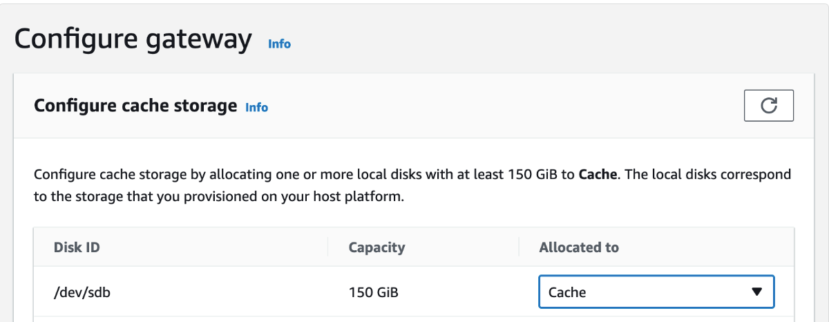 7. Once the gateway is activated, you can allocate cache storage from the local disks. It is recommended to only use Amazon Elastic Block Store (Amazon EBS) volumes for the gateway storage.
