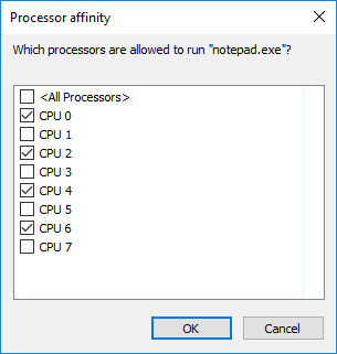 As you can see, all the CPUs are allowed to run this instance of notepad.exe. You can uncheck a few CPUs to exclude them. Windows is smart enough to allow any scheduled operations to continue to completion on disabled CPUs. It then saves its state at the next scheduling event, and resumes those operations on another CPU. To ensure that only one thread in each core is able to run a process, you uncheck every other core. This effectively disables HT Technology for this process. For example: