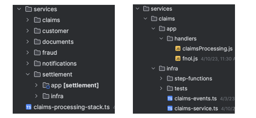 With the preceding structure, you can use the settlement-service.ts CDK construct inside claims-processing-stack.ts: