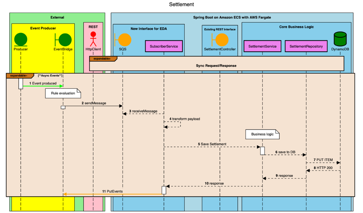 The settlement domain provides a REST service to the rest of the organization. A Docker containerized Spring Boot application runs on Amazon ECS with AWS Fargate. The following sequence diagram shows the synchronous request-response flow from an external REST client to the service: