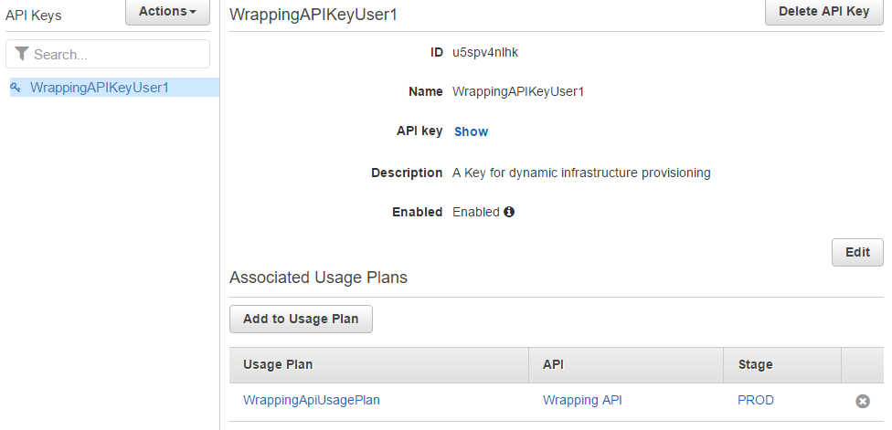 - Choose Add to Usage Plan and type WrappingApiUsagePlan. This usage plan defaults your Stage to PROD because it is the only configured stage.