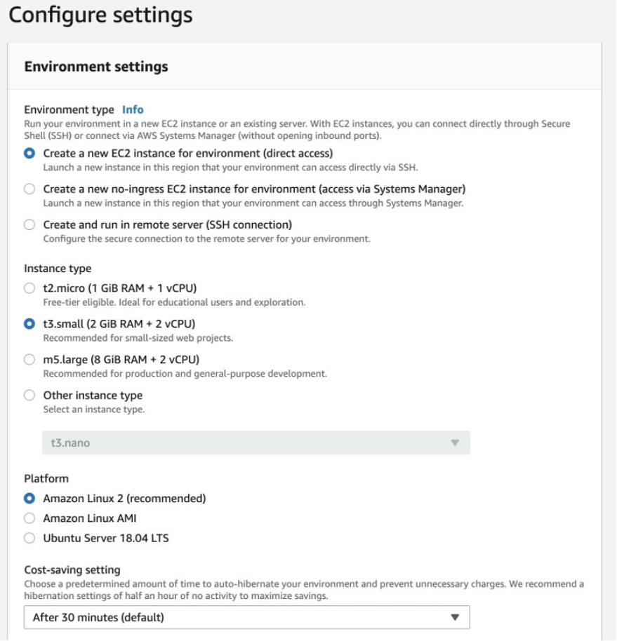 - Review the settings and create the environment. AWS Cloud9 automatically creates and sets up a new Amazon EC2 instance in your account, and then automatically connects that new instance to the environment for you.
