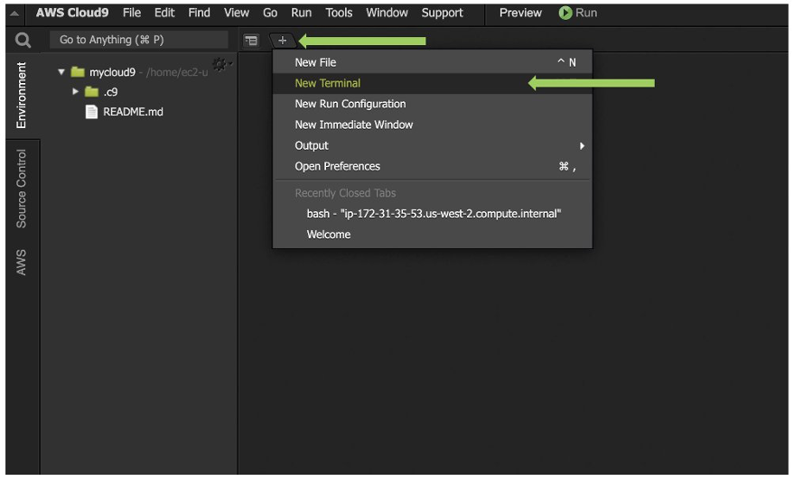 - On the menu bar (at the top of the AWS Cloud9 IDE), choose Window, New Terminal.