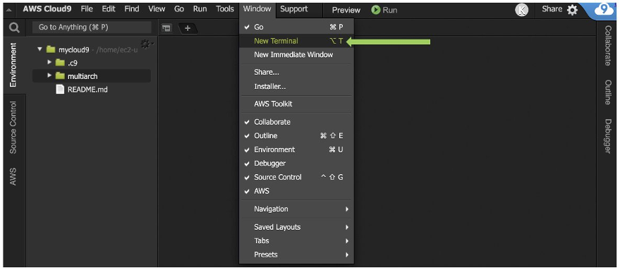 - In your Cloud9 IDE environment, create a new directory and name it multiarch. Save all files to this directory that you create in this section.