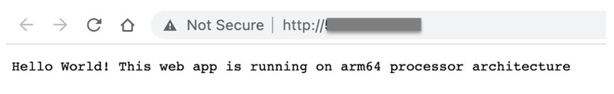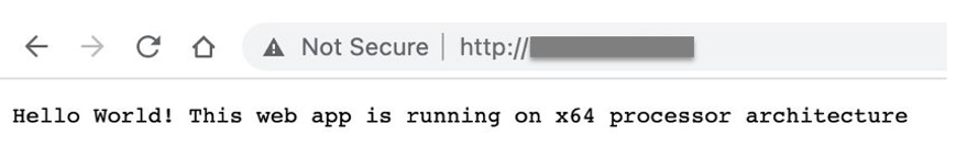 - Open your browser to public IP address of your x86 instance and validate your application is running. {process.arch} variable in the application shows the processor architecture the container is running on. This step validates that the docker image runs successfully on x86 instance.