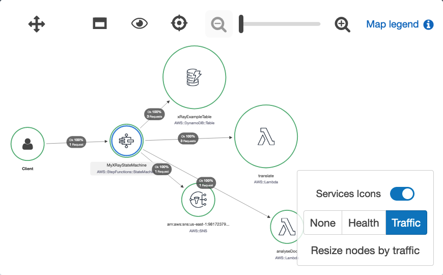 The Step Functions integration with X-Ray provides a single monitoring dashboard for workflows running at scale. It provides a high-level system overview of all workflow resources and the ability to drill down to view detailed timelines of workflow executions. You can now use the orchestration capabilities of Step Functions with the tracing, visualization, and debug capabilities of AWS X-Ray.