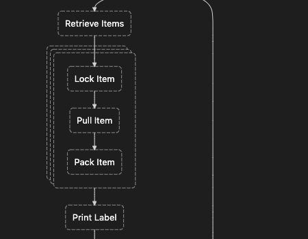 The following image provides a visualization of this workflow. A preliminary state retrieves the collection of items from a data store and loads it into the state under the orderItems key. The triple dashed lines represent the Map State which attempts to lock, pull, and pack each item individually. The result of processing each individual item impacts the next state, Print Label. As more items are pulled and packed, the total weight increases. If an item is out of stock, the total weight will decrease.
