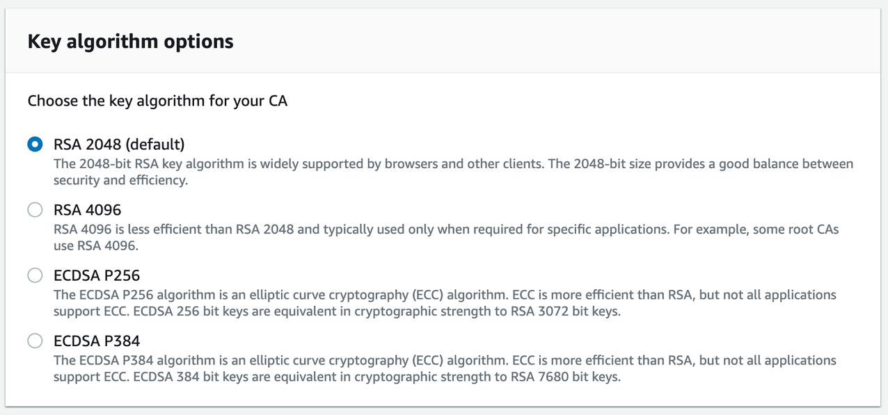 - From the Configure CA key algorithm panel, choose the key algorithm for your CA and choose Next.