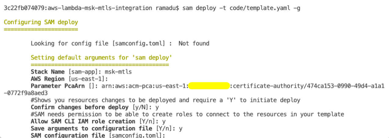 - Run sam deploy to deploy the infrastructure. Provide the Stack Name, AWS Region, ARN of the private CA created in section 1. Provide additional information as required in the sam deploy and deploy the stack.