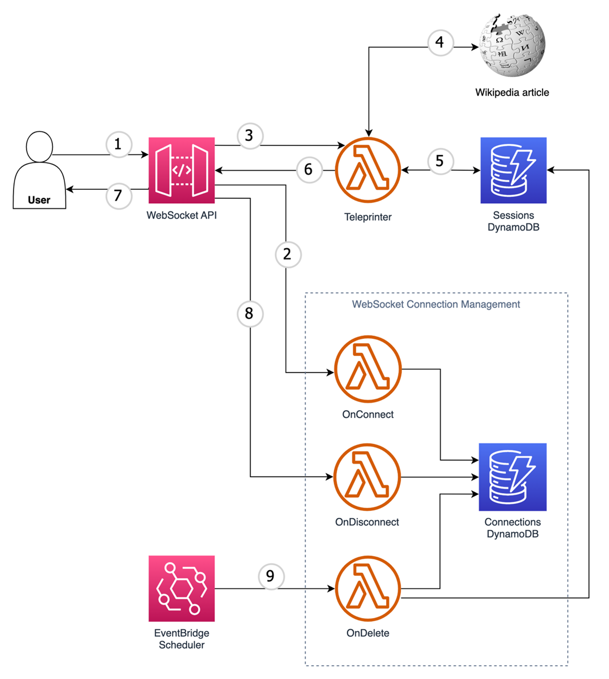 The sample uses Amazon API Gateway WebSocket APIs. It uses AWS Lambda for WebSocket connection management and for mocking a teleprinter to generate a stateful stream of characters for testing purposes. There are two Amazon DynamoDB tables for storing connection IDs and user sessions, as well as an optional MediaWiki API for retrieving an article.