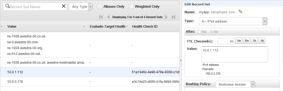 - The route53 registry created by ECS is shown below. We see two DNS entries corresponding to the DNS endpoint myapp.sampleaws.com.