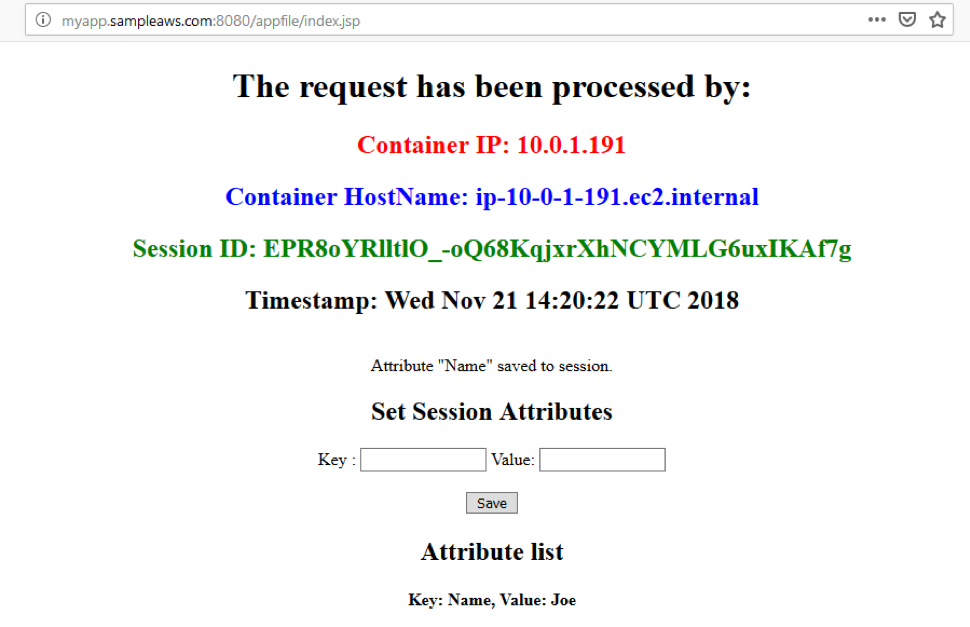 - Open in different browsers & tabs & verify the Container IP & session ID. Now force shutdown a node by resizing the ECS service task instances to one. Note that though the container IP in the webapp changes, the session ID does not change and the webapp is available and the HTTP Session is alive thus demonstrating the session replication & failover amongst the clustering nodes.