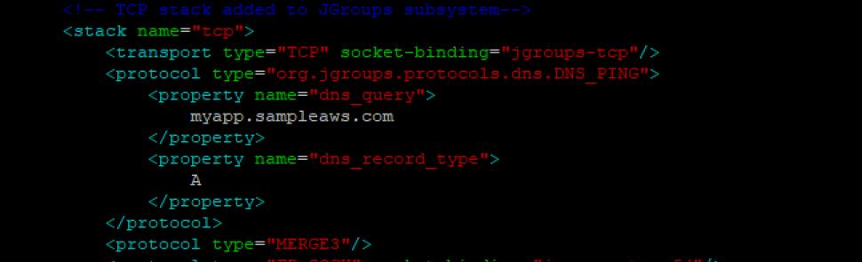 - Modify the JGroup Subsystem – Add a TCP Stack with DNS_Ping as the discovery protocol & configure the DNS Query endpoint. It is important to note that the DNS_QUERY matches the ECS service endpoint when configuring the ECS service.