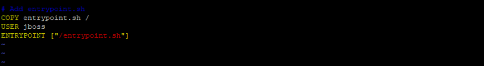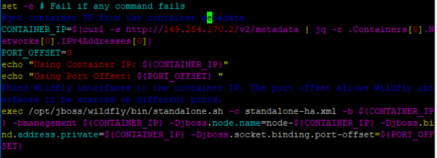 - Define a custom entrypoint, entrypoint.sh, to boot Wildfly with the specified bind IP addresses to its interfaces. The script gets the container metadata, extracts the container IP to bind it to Wildfly interfaces. This interface binding is an important step as it enables the application related network communication (web, messaging) between the containers.