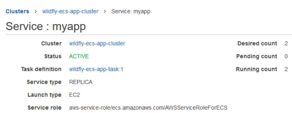 - While configuring the ECS service, ensure that the service name & namespace should combine to form service endpoint that exactly matches the DNS_Query endpoint configured in Wildfly configuration file. The container security group should allow inbound traffic to port 8080. Here is what the service endpoint looks like: