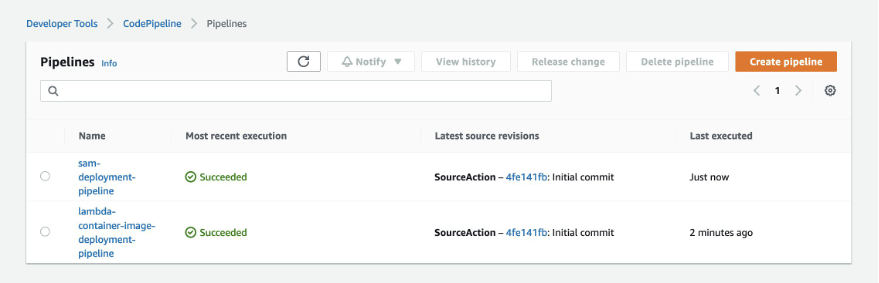 This example deploys two separate pipelines. The first is called the modernize-deployments-with-container-images-in-lambda, which consists of building and deploying a container-image to ECR using Docker and the AWS CLI. An EventBridge event starts the pipeline when the CodeCommit branch is updated.