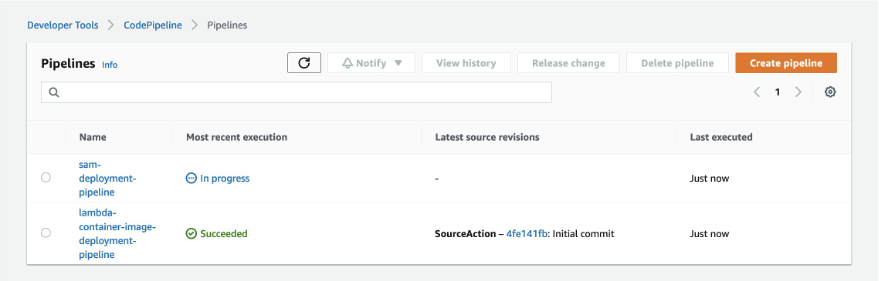 This example deploys two separate pipelines. The first is called the modernize-deployments-with-container-images-in-lambda, which consists of building and deploying a container-image to ECR using Docker and the AWS CLI. An EventBridge event starts the pipeline when the CodeCommit branch is updated.