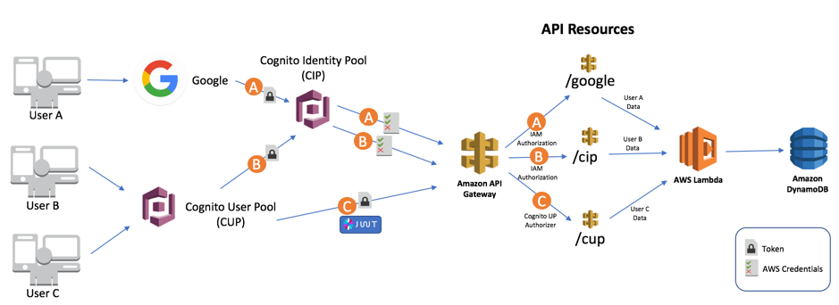 Here’s the basic concept. You have a sample application that authenticates its users with three different IdPs. You also have an API Gateway API with three different resources (paths), one for each type of user. Each provider can only access one API-specific resource/path and cannot access any other resource allocated to other providers.
