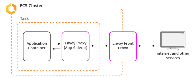 The Envoy front proxy acts as a reverse proxy. It accepts incoming requests and routes them to ECS service tasks that can have an envoy sidecar themselves. The envoy sidecar then redirects the request to the service on the local host.