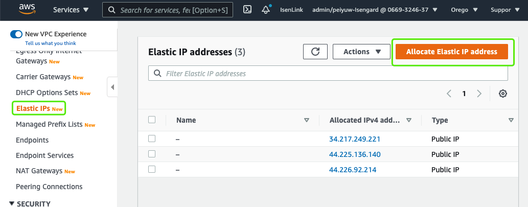 - In the navigation pane of the VPC console, choose Elastic IPs, then “Allocate Elastic IP address”. Choose Amazon’s pool of IP addresses for the public IPv4 address pool, and choose Allocate. Record this IP address, as it is used in the next step.