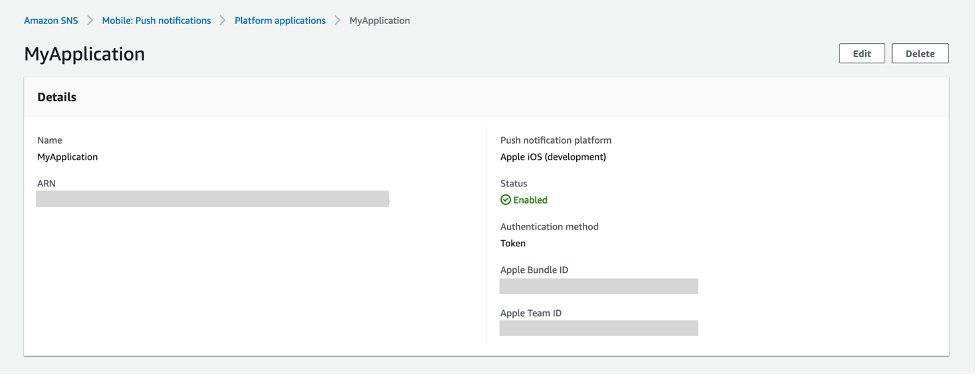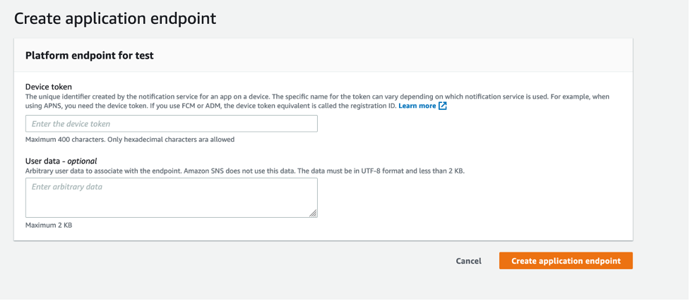 - From the details page of the platform application in the SNS console, choose Create application endpoint.