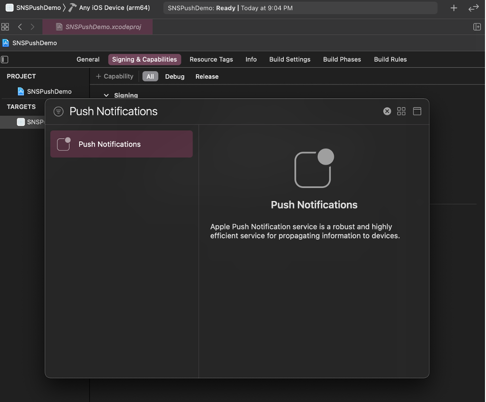 SNSPushDemoApp.swift, add the following code to print the device token and receive push notifications.import SwiftUI @main struct SNSPushDemoApp: App { @UIApplicationDelegateAdaptor private var appDelegate: AppDelegate var body: some Scene { WindowGroup { ContentView() } } } class AppDelegate: NSObject, UIApplicationDelegate, UNUserNotificationCenterDelegate { func application(_ application: UIApplication, didFinishLaunchingWithOptions launchOptions: [UIApplication.LaunchOptionsKey : Any]? = nil) -> Bool { UNUserNotificationCenter.current().delegate = self return true } func application(_ application: UIApplication, didRegisterForRemoteNotificationsWithDeviceToken deviceToken: Data) { let tokenParts = deviceToken.map { data in String(format: "%02.2hhx", data) } let token = tokenParts.joined() print("Device Token: \(token)") }; func application(_ application: UIApplication, didFailToRegisterForRemoteNotificationsWithError error: Error) { print(error.localizedDescription) } func userNotificationCenter(_ center: UNUserNotificationCenter, willPresent notification: UNNotification, withCompletionHandler completionHandler: @escaping (UNNotificationPresentationOptions) -> Void) { completionHandler([.banner, .badge, .sound]) } } - In