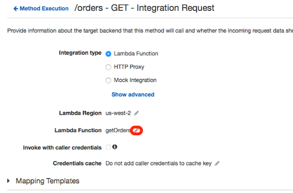 Open the StoreFrontV2 API and choose the GET method of the /orders resource. Next, choose Integration Request. Choose the edit icon next to the getOrders Lambda function name.