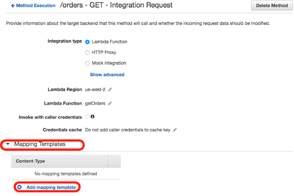 Expand the default response mapping (HTTP status 200), and expand the Mapping Templates section. Choose Add Mapping Template.