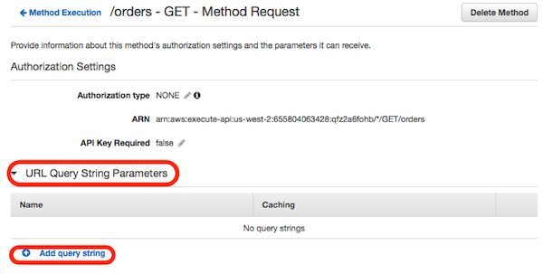 Back to the GET method configuration page, in the left pane, choose the GET method and then open the Method Request settings. Expand the URL Query String Parameters section and choose Add query string. In Name, type start and choose the check mark to accept. Repeat the process to create a second parameter named end.