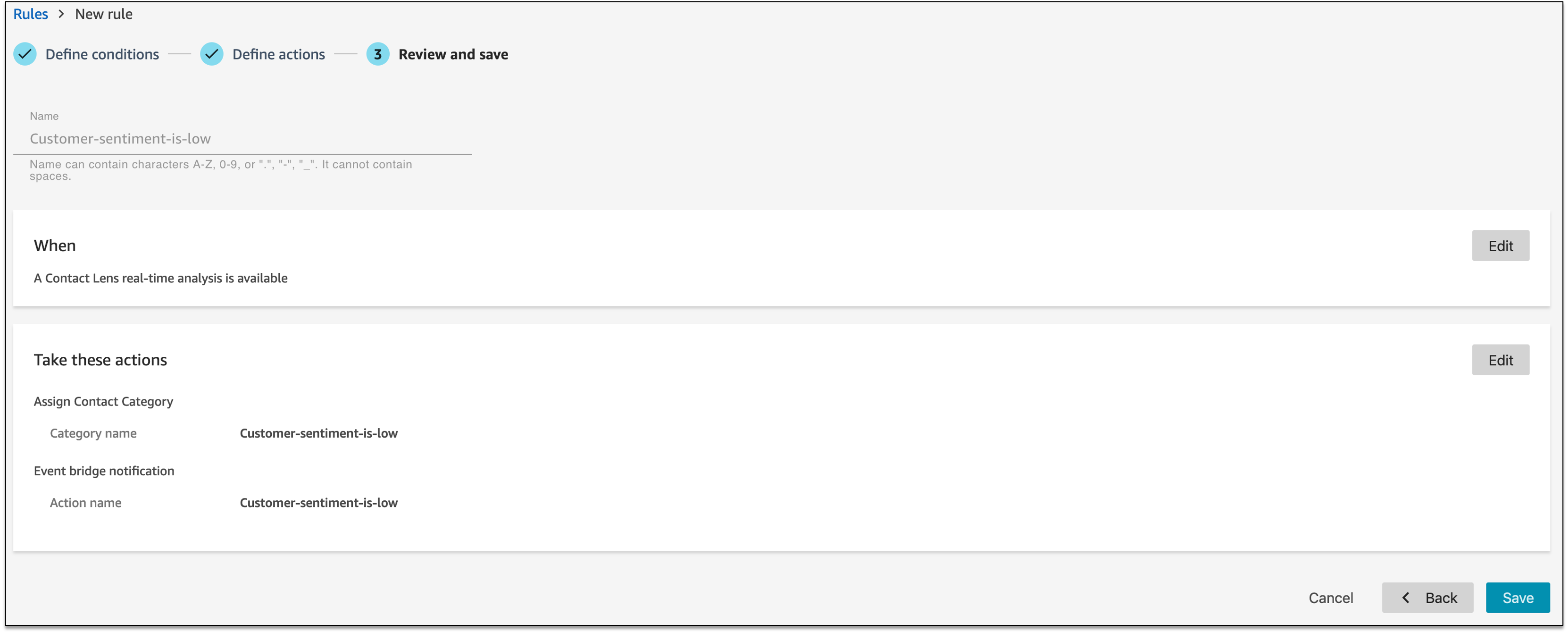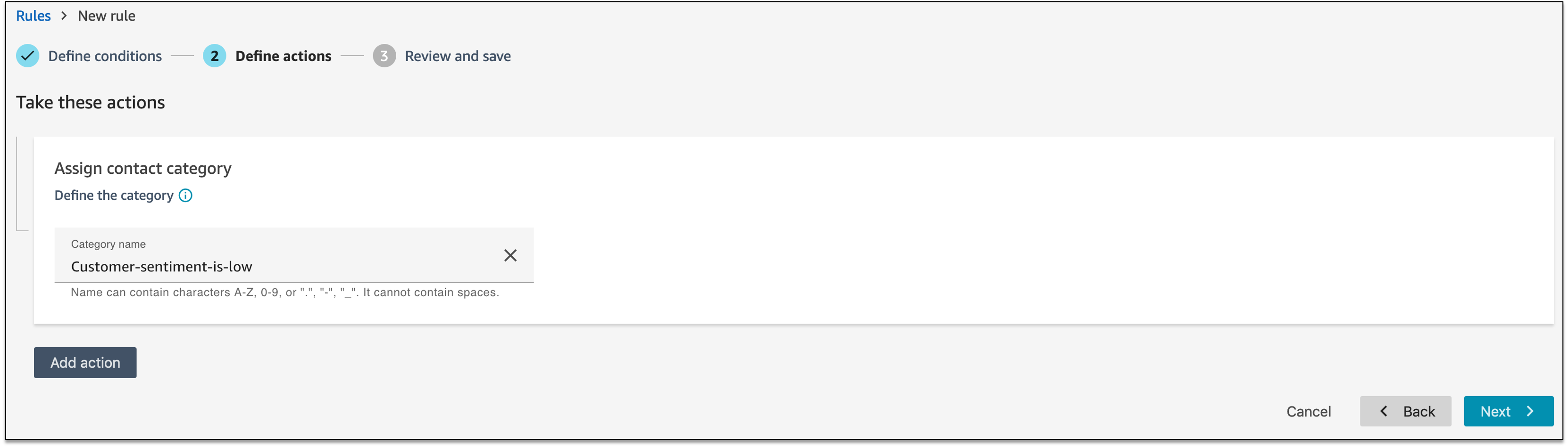 - First “Assign contact category” the category name “Customer-sentiment-is-low”