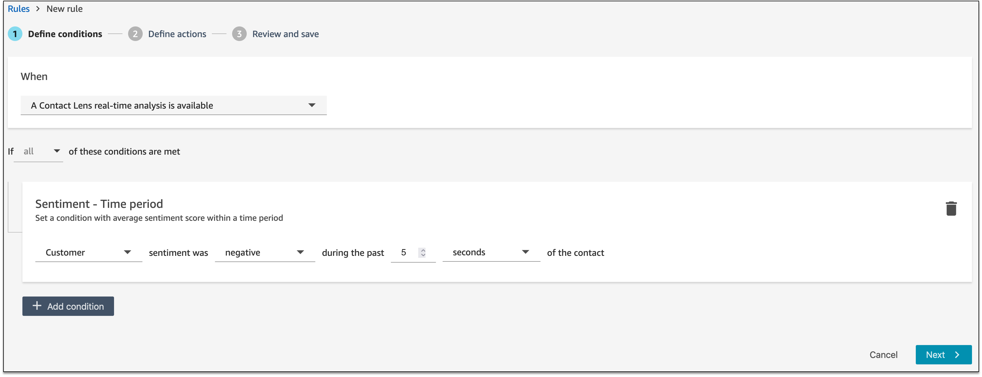 - Select “Add condition” and choose “Sentiment – Time Period”