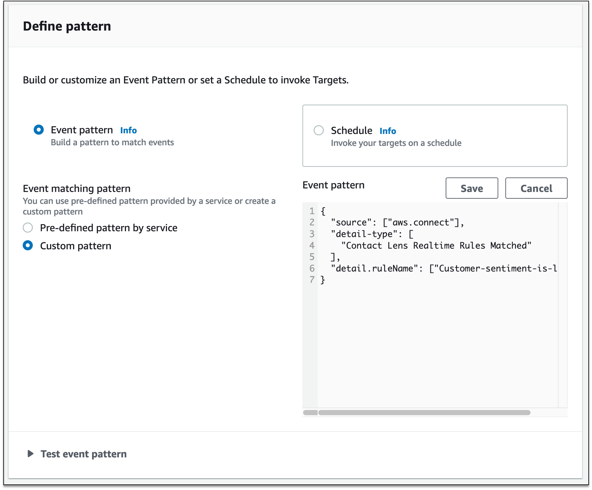 - Copy and paste the below pattern into the “Event pattern” text field and then click “Save”