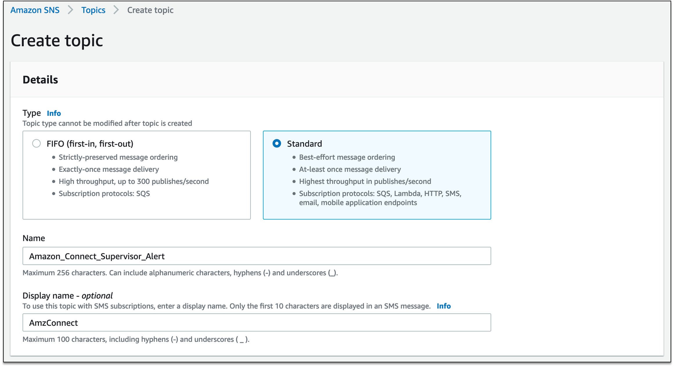 - Scroll down to “Select targets” and select “SNS topic”. Choose the topic we created named “Amazon_Connect_Supervisor_Alert” and then select “Create”