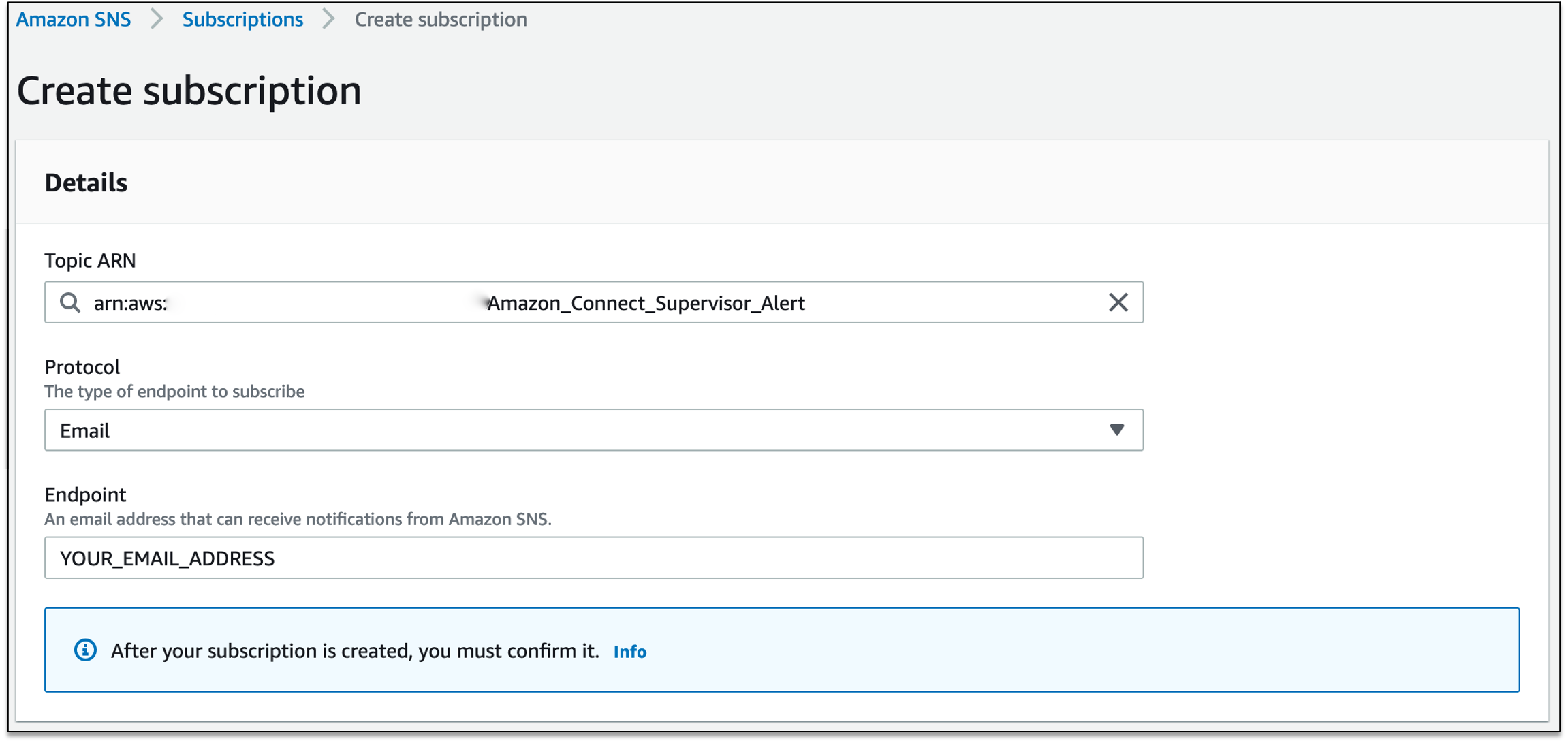 Using Simple Notification Service, a fully managed messaging service for both application-to-application and application-to-person communications we can quickly setup email notification when our Contact Lens rule is triggered.
