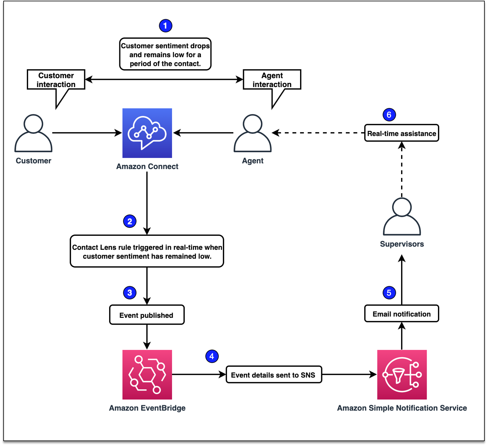 Using Contact Lens sentiment operator combined with Amazon EventBridge and Amazon Simple Notification Service you are able to build a simple and highly reliable notification system supporting various delivery mechanisms including email, SNS and mobile push notification. From there, supervisors can listen in on the live call and provide guidance to an agent over chat to resolve the issue faster. If necessary, supervisors can have the call transferred from the agent, both which ensures customers are provided with the best experience possible.