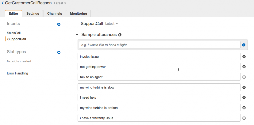 The first step is to setup two Amazon Lex bots: GetCustomerCallReason and GetCaseNumber. GetCustomerCallReason will have two intents: SalesCall and SupportCall. For each of these intents, you’ll want to populate them with utterances that reflect the reason for each type of call. Here are screenshots of both intents to give you some ideas: