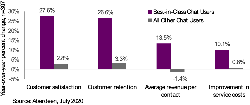 Aberdeen’s new August 2020 Integrate Chat with Your Omni-Channel Programs to Maximize Success study sheds more light on the benefits of integrating chat with omni-channel programs to maximize the return on investment (ROI) of chat capabilities. As depicted in Figure 1 below, top performing firms using chat capabilities achieve 9.9x greater annual increase in customer satisfaction rates, compared to their lower performing counterparts using chat in a siloed fashion (27.6% vs. 2.8%).