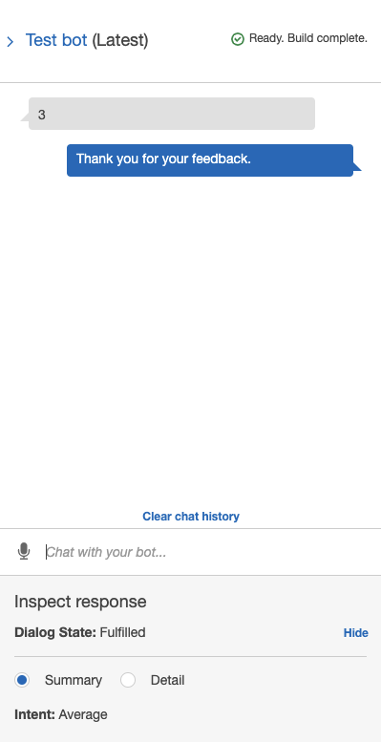 4. Test it at the right side of the console. Type ‘3’ and see verify the response received is accurate by checking the Intent at the Inspect response section at the bottom.