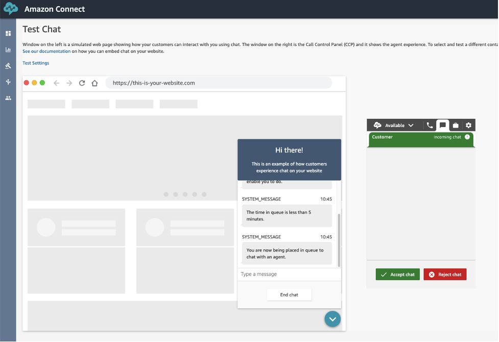 5. Wait for an incoming chat request to come in on the right agent panel, and click Accept chat.