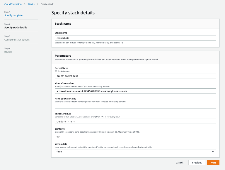 - If you want to create a new Kinesis Stream, leave the KinesisStreamArn parameter blank and fill in the KinesisStreamName parameter
