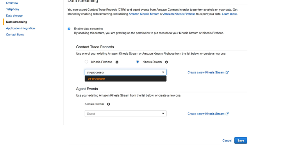 3. Choose Kinesis Stream and under the dropdown, select ctr-processor that was deployed in the CloudFormation template.